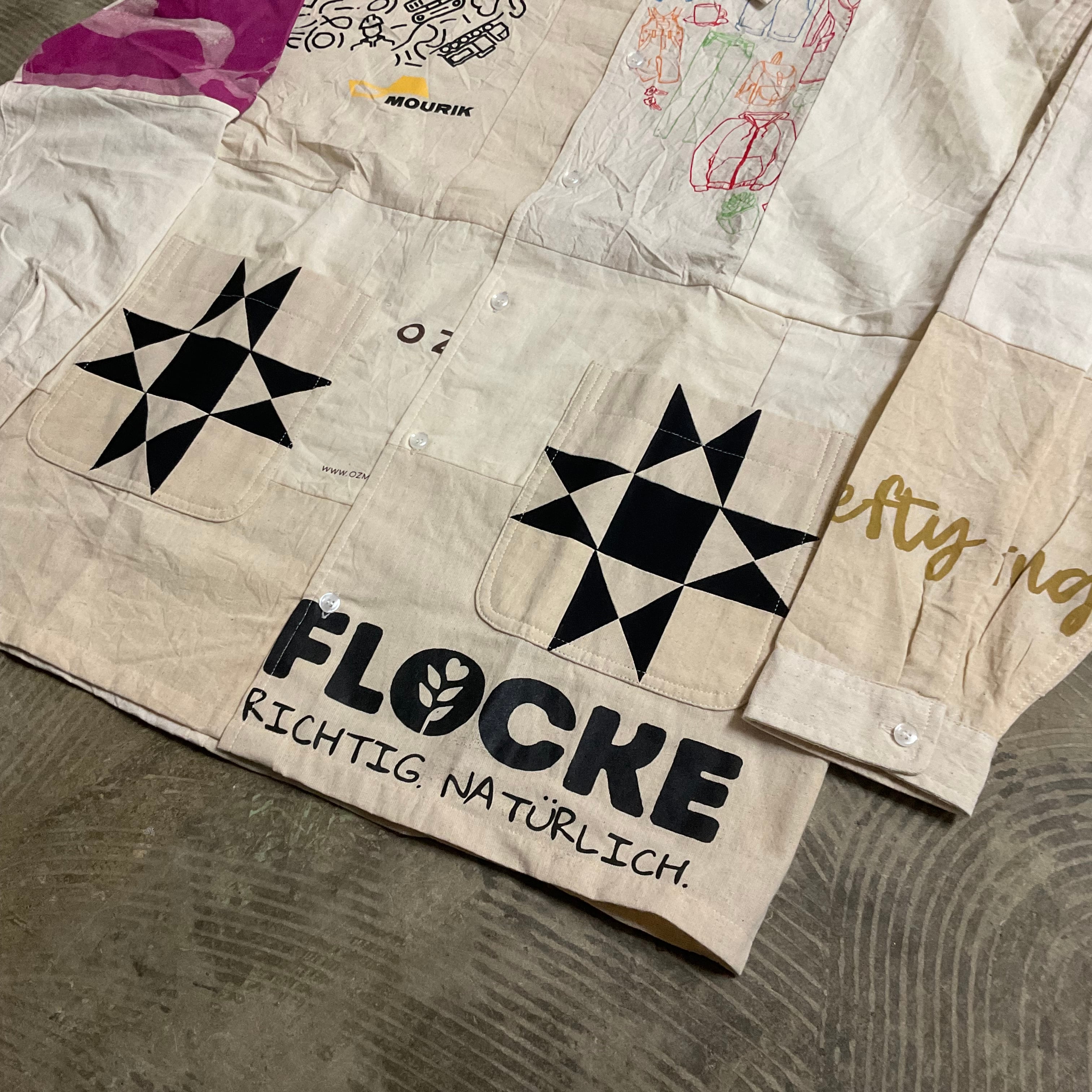 USEDエコバッグ生地の柄を活かし、一枚一枚異なるカッティングにて再構築したアイテム。